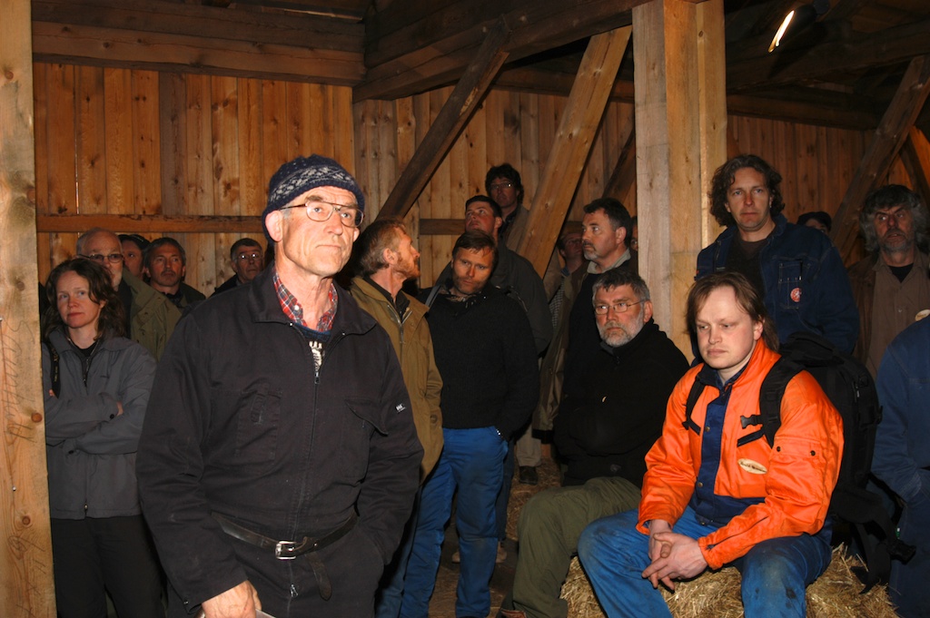 Det pleier å bli folksomt I Bygningshistorisk park på Dovre når Nordisk Treseminar holdes. Her er det tradisjonshåndverkeren og forfatteren Jon Bojer Godal som har ordet, og tilhøreren i rød jakke er Roald Renmælmo, en annen tradisjonshåndverker som også vil bli å finne på Dovre under seminaret.