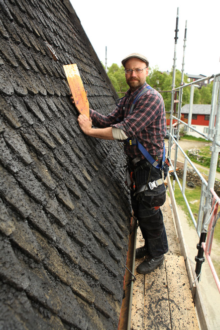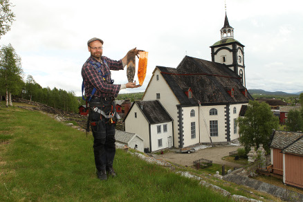Fra taket til Røros kirke er det storslått utsikt over Bergstaden, slagghaugene som ligger igjen etter flere hundre års gruvedrift, og alle de gamle bygningene som Røros er så kjent for. På toppen av taket henger Kolbjørn Vegar Os i en sele, nærmest som en fjellklatrer, mens han demonstrerer hvordan sponene ble skiftet ut. Ett og ett. Møysommelig.