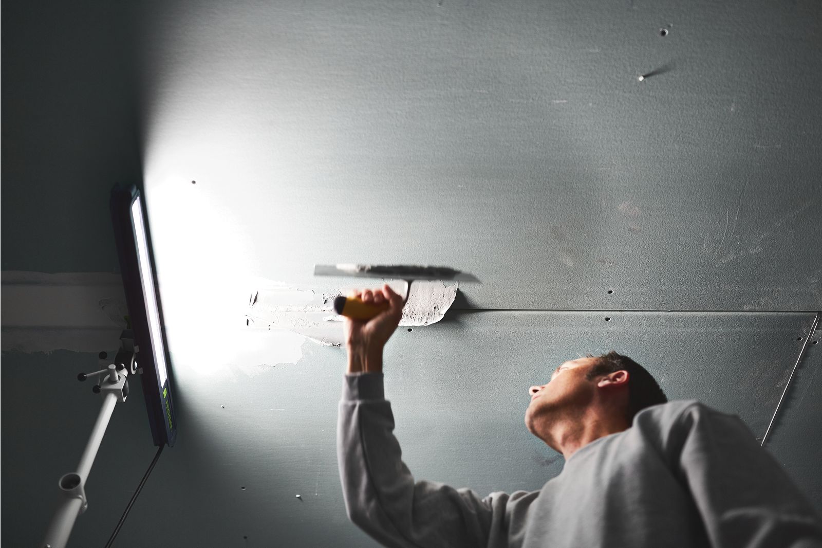 Lampen er den andre i Festools Syslite serie og gir et lys fra mange små LED-lamper på 1500 lumen / 5 000 grader Kelvin, som er en litt kjølig lystemperatur – perfekt for å oppfange små ujevnheter på vegger og andre områder.