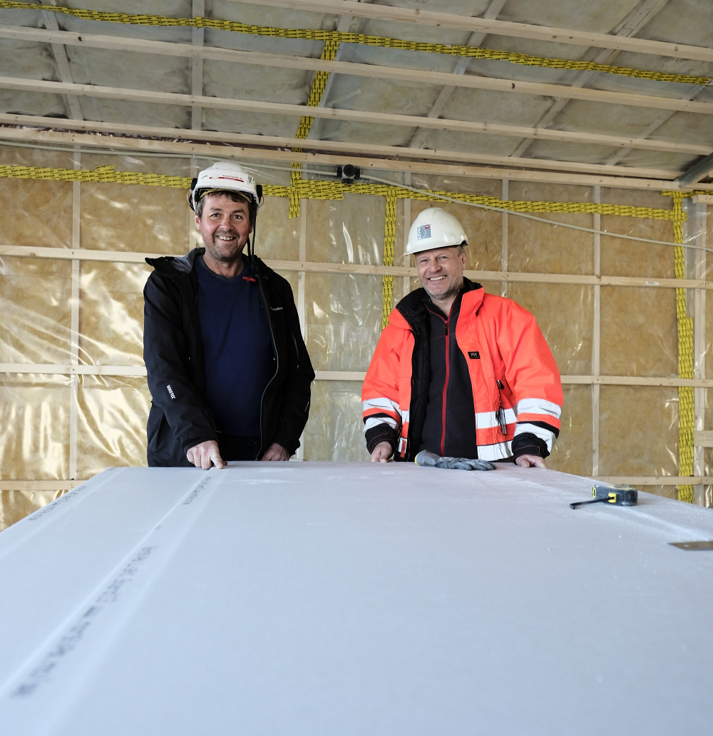 – Du kjenner at den er lettere. Vi har jo ikke lov å løfte en standardplate alene, så det er greit at vi gikk over til lettere plater, sier Martin Svanvik Eide. Tømrersvennen er tilbake etter lunsj og skal gipse med broren Eirik.
