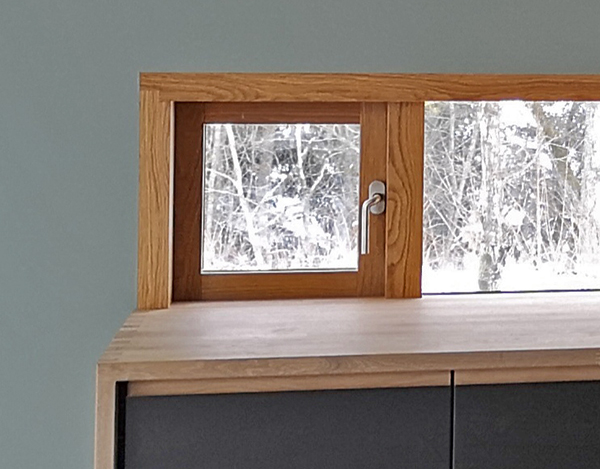 En lekker detalj rundt ett av kjøkkenvinduene. Vinduskarmene er i eik. (Foto: Arkitektene)