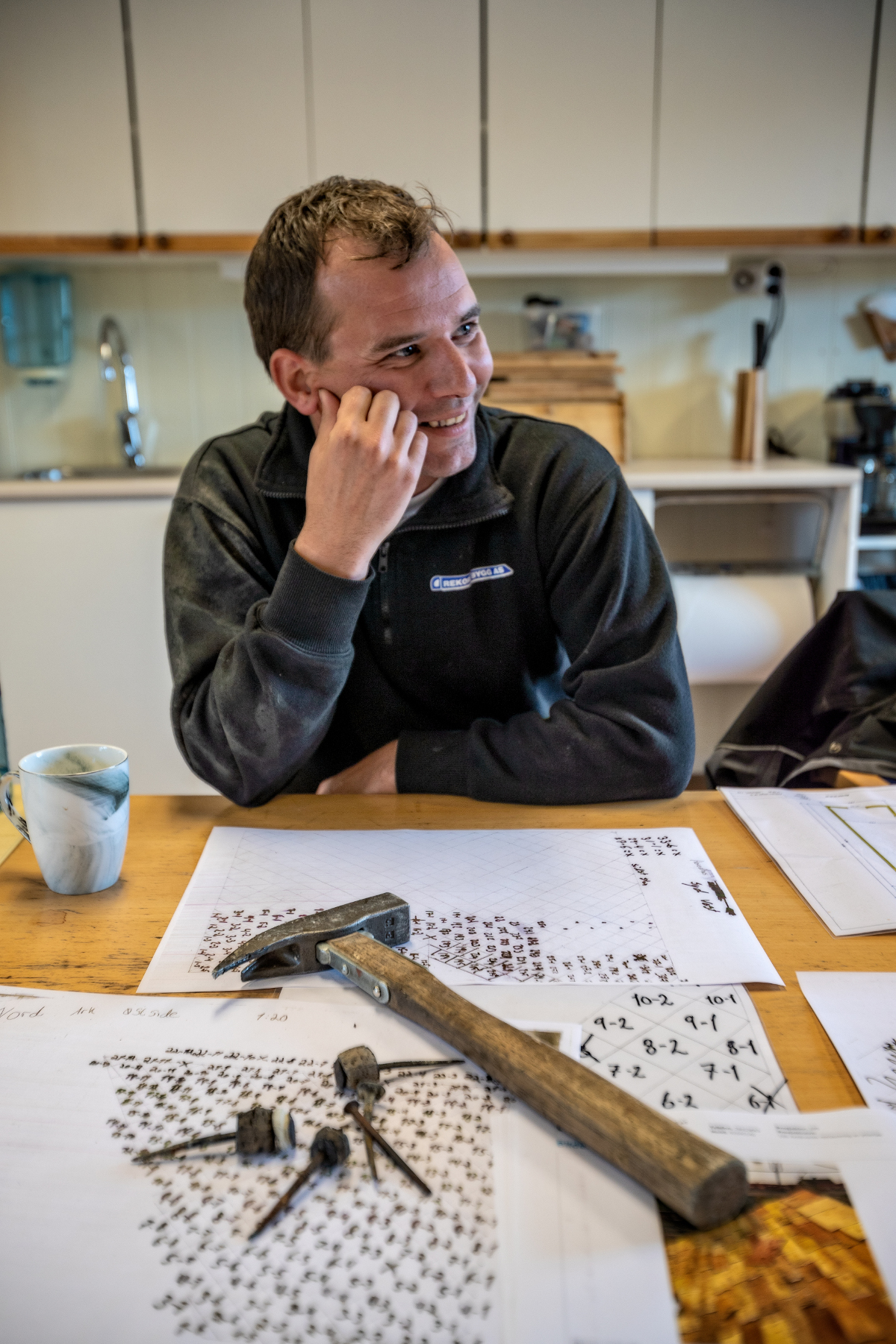 – Jeg brukte til sammen tre dager på å tenke ut en løsning og på å tegne takkonstruksjonen – før jeg tok en eneste spiker ut av skiferen. All skiferen ble merket, og jeg laget et stort kart over taket. Det er veldig mange skifersteiner på taket, og selv om vi bare jobbet på halve takstolen, tar det ufattelig lang tid å kartlegge. Så var det å ta dem ned én etter én. Den eneste overraskelsen da, var at det øverste taktroa var så tynn.