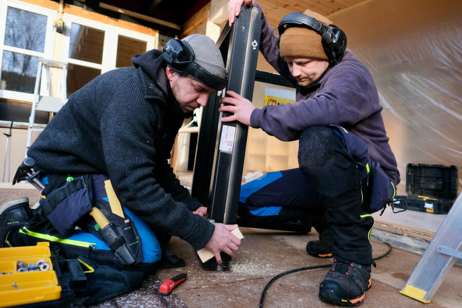 Idag skal Dyb og tømrerne Stian Slettbakken og Fredrik Mæhlum montere ti vinduer og en skyvedør på 250 kilo. Slike oppgaver har blitt langt enklere siden vaterskruen Levelfix kom på markedet, mener håndverkerne.