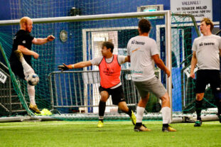 – Her er det skikkelig trøkk! Og jeg som ikke har spilt siden grusbanen på Grua i 1989, sier en svett tømrermester.