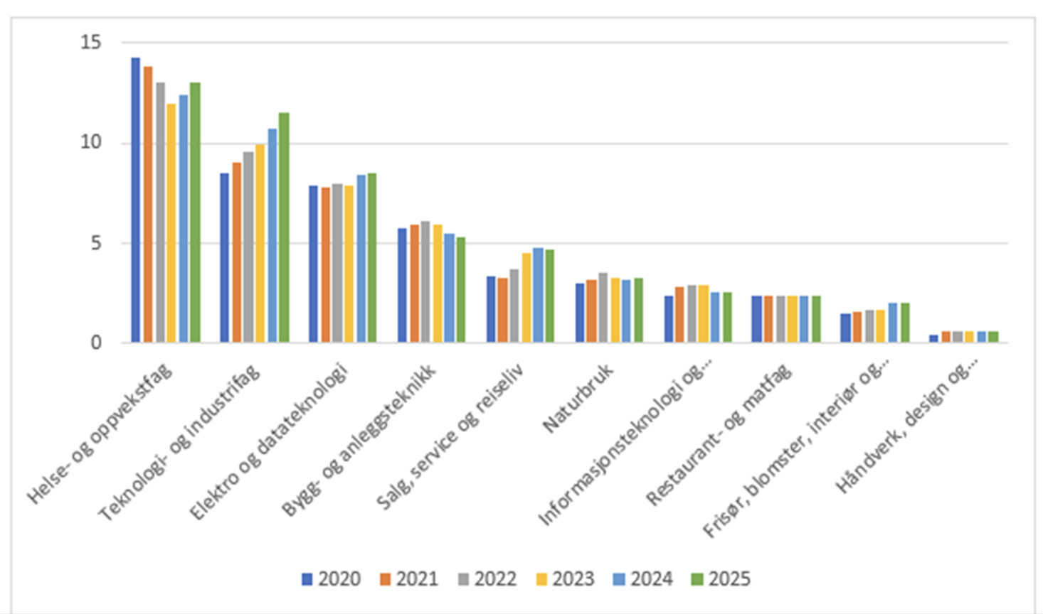 Helse- og oppvekstfag er det yrkesfaglige utdanningsprogrammet som flest har som førsteønske på vg1; 13 prosent av alle søkerne til vg1 har dette som førsteønske. Etter flere år med nedgang, har andelen søkere økt igjen de siste to årene og er nå tilbake på nivå som i 2022.