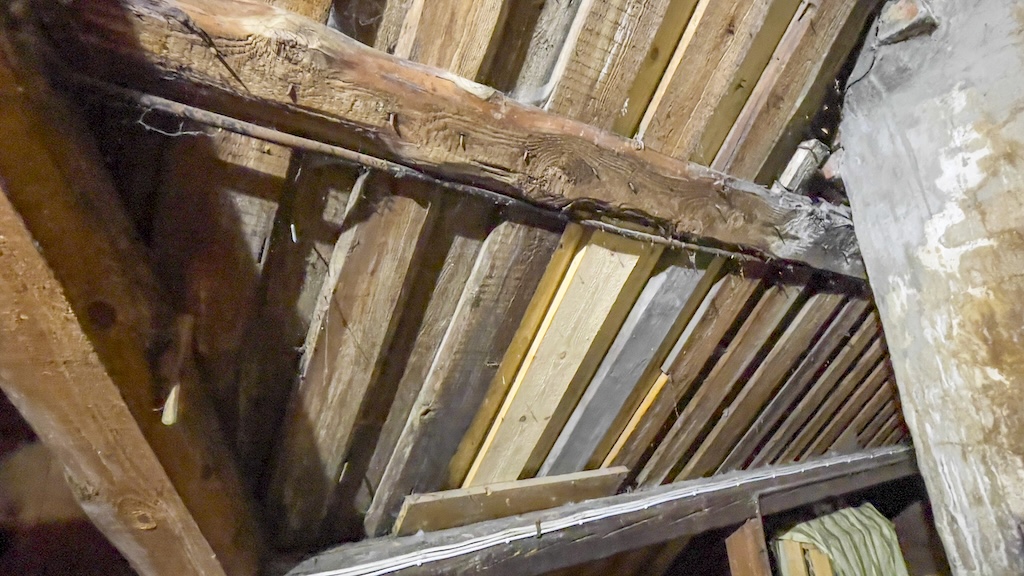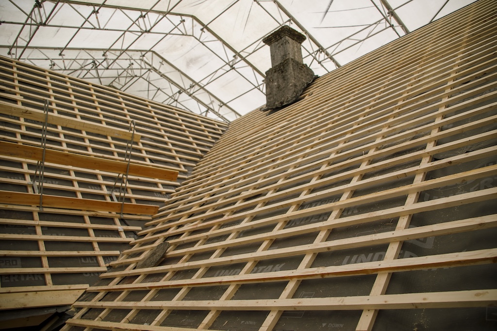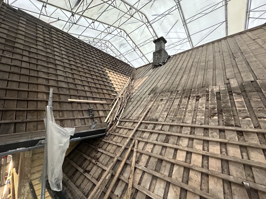 Nå er de råtne delene av sutaket skiftet ut med tilsvarende plank i kjerneved. Oppå sutaket er det lagt 18 mm tykke huntonittplater. Oppå det igjen, diffusjonsåpen papp. For å forebygge nye skader, foregår alt arbeid under et tak-over-tak-system.