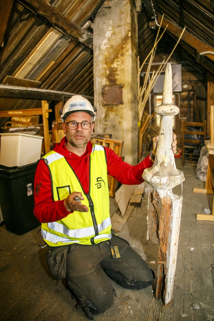 – Vi trengte ikke å bytte kledning da den var av kvalitetsmaterialer. Men vi har tatt ned de to spirene. Det ene var helt råttent så vi må lage et helt nytt spir. Det andre kan vi bruke på ny, sier Tjensvoll.
