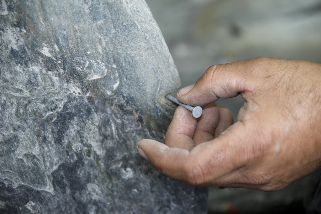 Når skifer av god, holdbar kvalitet er skaffet til veie, kan taktekkingen ta til. Nesten. For først må skiferen sorteres: De tynneste steinene for seg, de middels tynne for seg, og de tykkeste for seg.