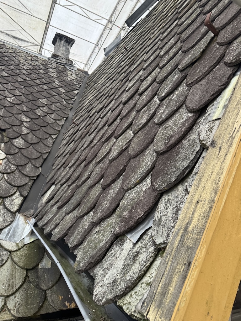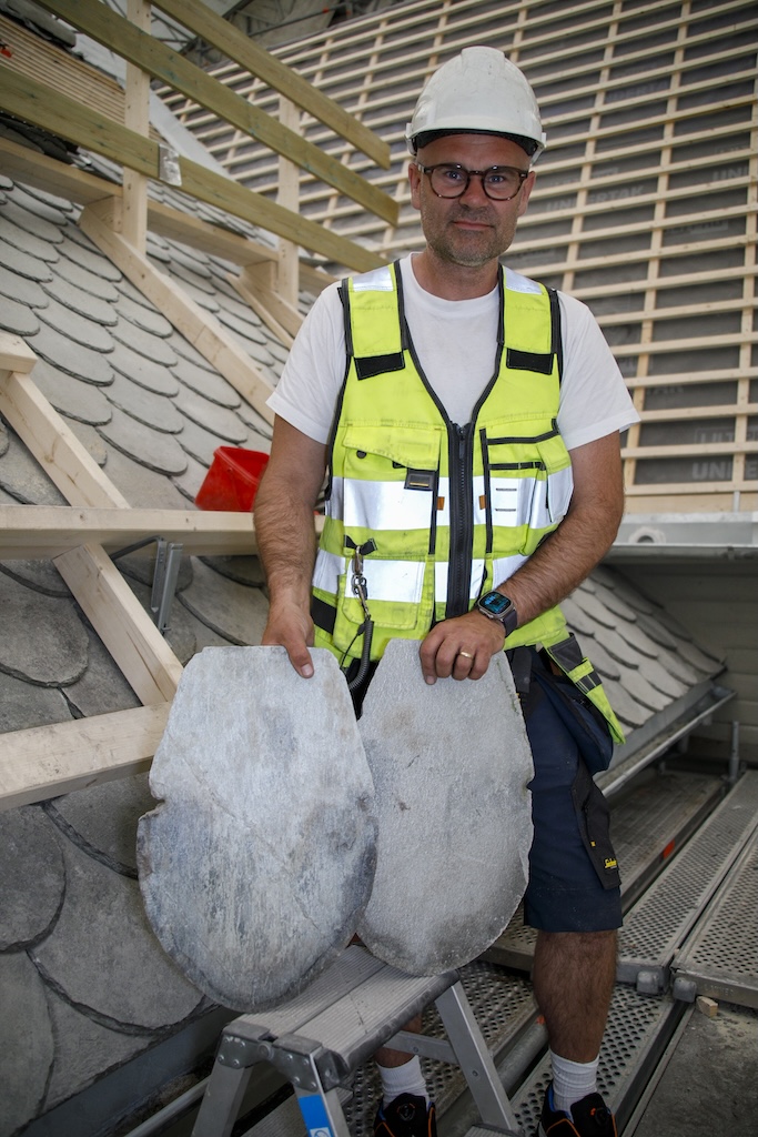– Skiferen var for dårlig. Det dannet seg krater da vi skulle lage nye hull, slik at skiferen ikke festet seg. Da ble jeg skeptisk. Taket skal tross alt stå i 100 år til. Da må vi fokusere på kvalitet, understreker han.