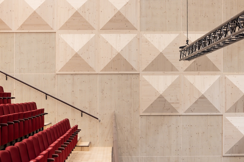 Egendesignede pyramideformede bokser gir veggene et særpreget estetisk uttrykk med akustiske fordeler.