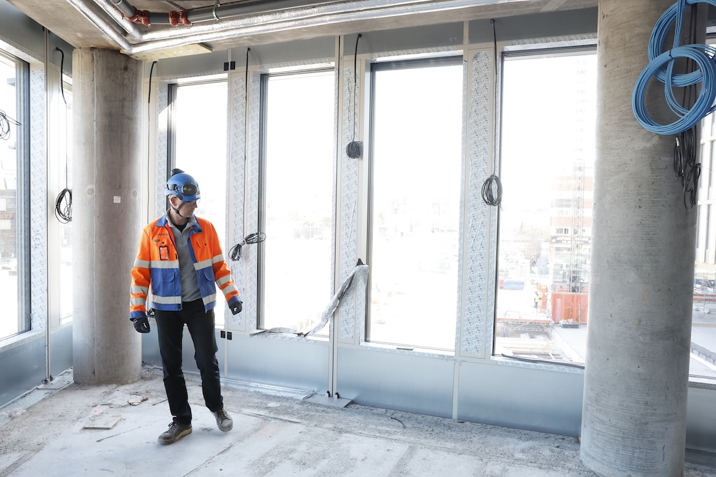 – Alt er forberedt. Når fasaden er oppe, er det klart for elektriker, gips og himling. Det er en effektiv måte å jobbe på, uten å vente på tradisjonell lukking med klimavegger og vinduer, sier Haakull.