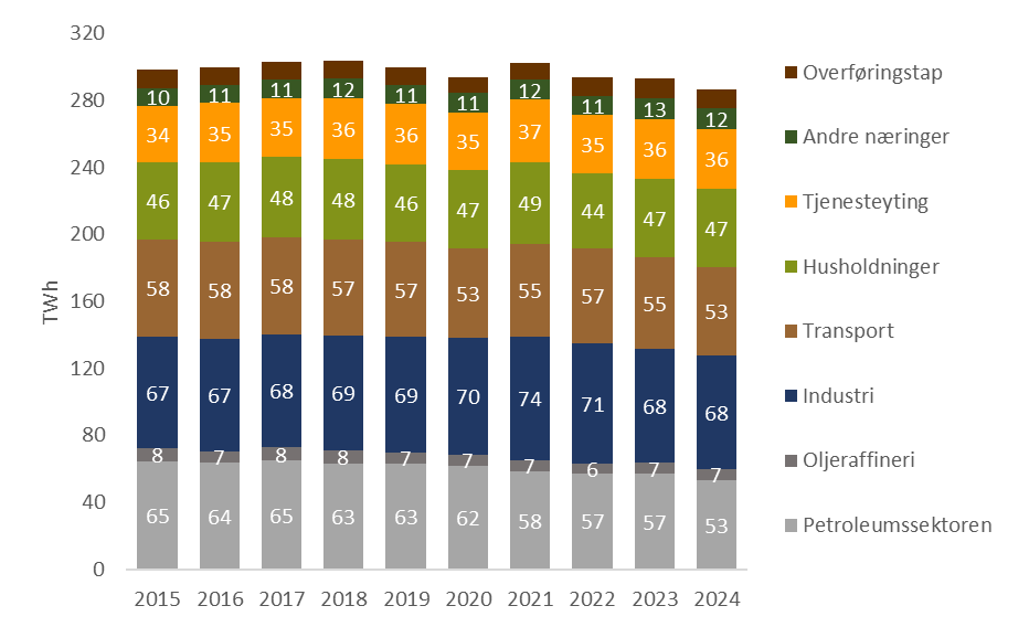 Samlet energibruk i Norge etter sektor fra 2015 til 2024. (Kilde: SSB)