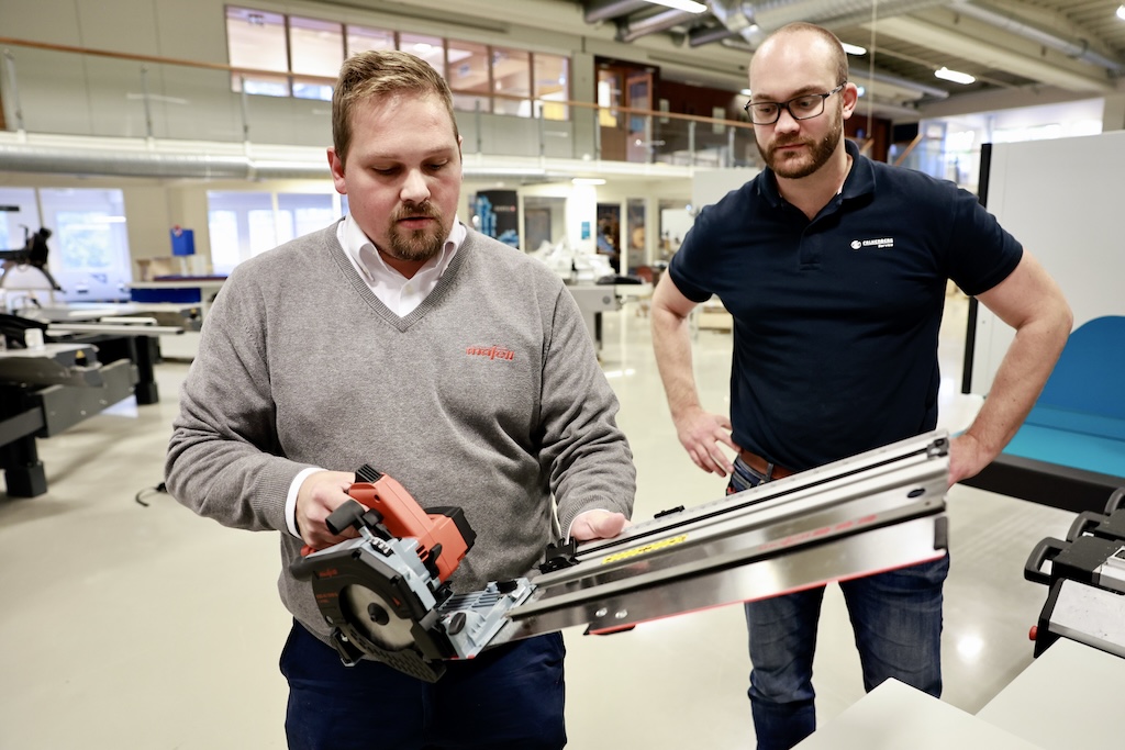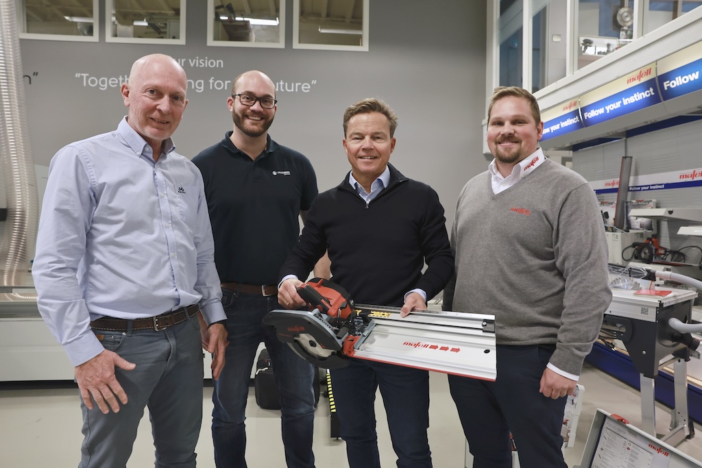 Produktansvarlig Kjetil Hjelleset, avdelingsleder Sondre Juul Christiansen og daglig leder Jann Bjørne (med kappsag) i Falkenberg samarbeider tett med Rasmus Flodin som er Mafells representant i Norden. (Alle foto: Byggmesteren)