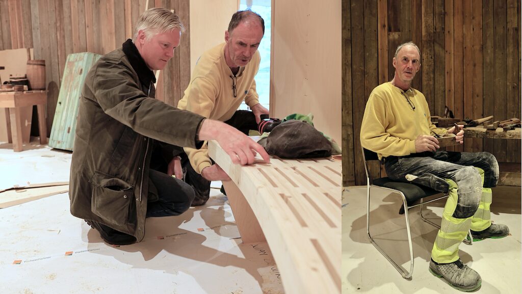 - Det er meningsfylt å bygge et museum som også viser fram tradisjonshåndverk, sier tømrer Russel Duncan Cosgrove (t.h) i Ø. M. Fjeld med en eldre høvel fra utstillingen. I bildet til venstre ser Jonas Nykänenog og han over spilebenken som Cosgrove bygger for museet.
