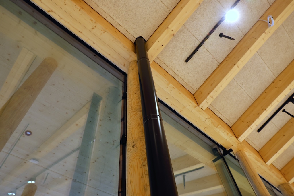 En av de mest iøynefallende delene av bygget er søylekonstruksjonen utenfor glassfasaden. De 380 tømmerstokkene danner en rytmisk vertikal struktur som filtrerer lys og gir assosiasjoner til skog.