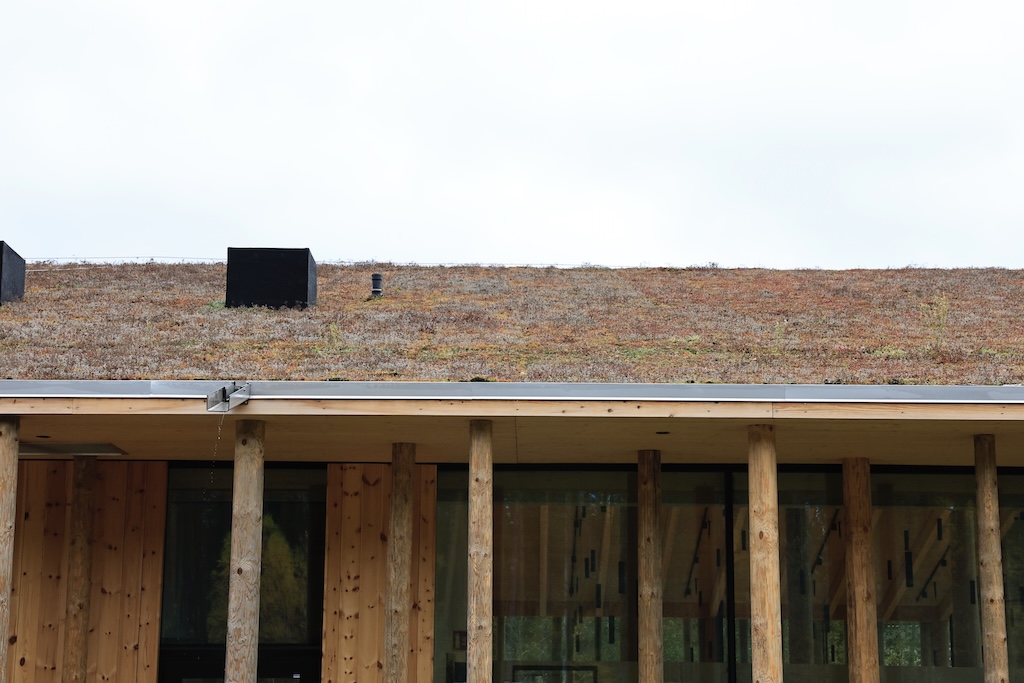 Trebygget rommer utstillinger, bibliotek, auditorium og kafé under ett stort tak – et konsept som arkitektene kaller “one roof”. Bygget er på rundt 2 300 kvadratmeter med kjeller og hems, utført i massivtre og limtre med et grønt kompakt-tak.