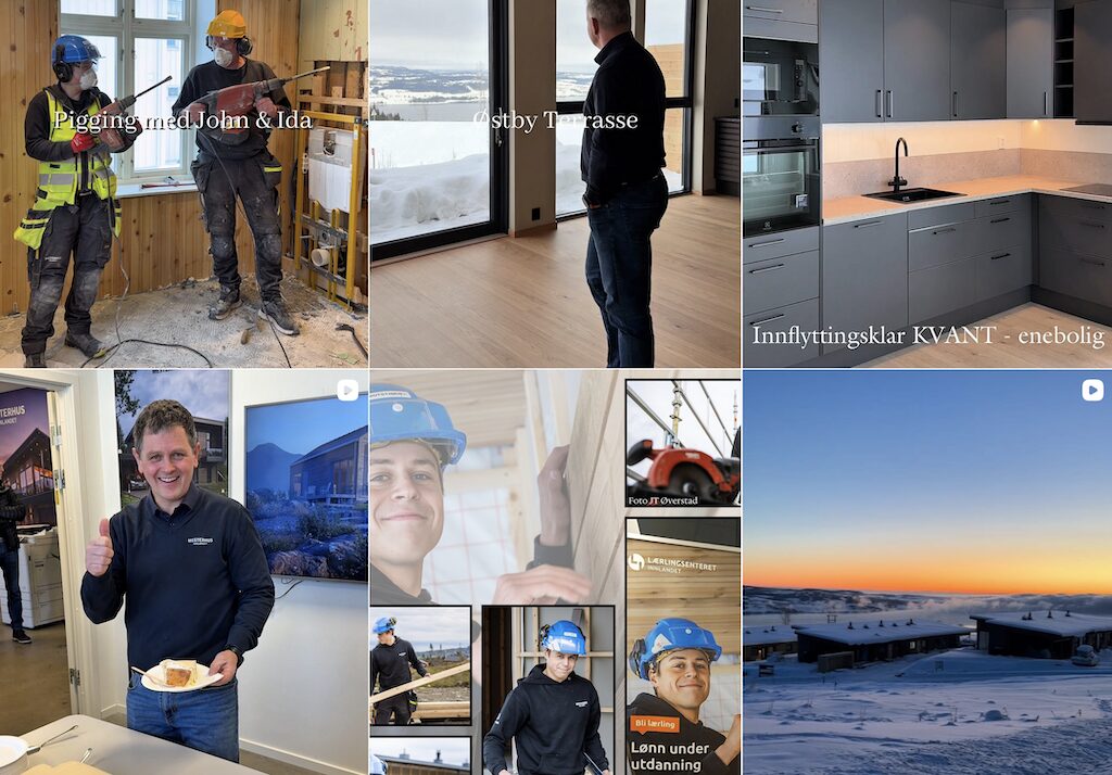 Følgere av Mesterhus Innlandet får ukentlige, glade oppdateringer om lærebedriften og boligene de bygger. (Foto: Skjermdump Instagram)