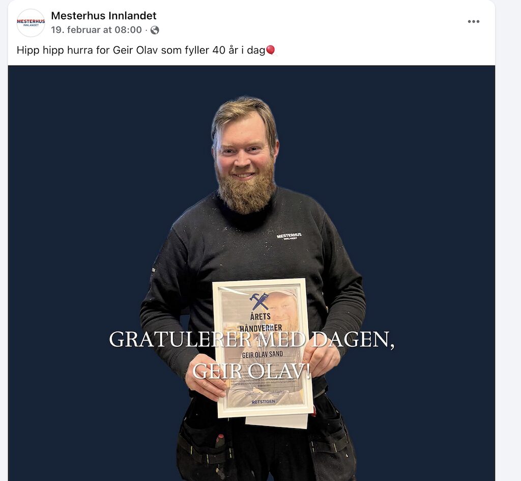 Da tømrer Geir Olav Sand ble kåret til Årets Håndverker i Mesterhus og samtidig fylte 40, var det en god anledning til å gratulere på sosiale medier. (Foto: Skjermdump Facebook)