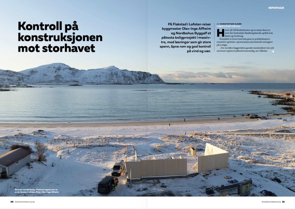 – Vi er Nordbohus-forhandler, men jobber mye i spesial markedet. Næringsbygg, spesialtegnede boliger og prosjekter, sier byggmester Olav-Inge Alfheim i Bodø. Bli med til Flakstad og se hvordan tømrere og kranførere reiser en konstruksjon som skal tåle mer enn de fleste.