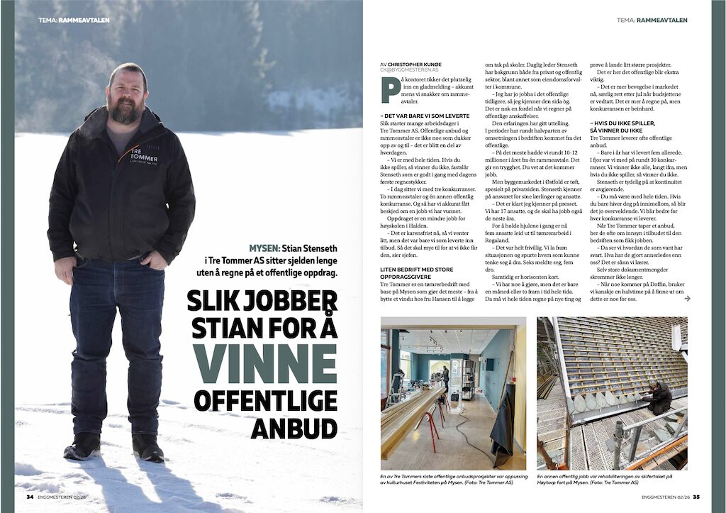I temautgaven møter du også byggmester Thomas Gausvik som mener at unødvendig byråkratiet stopper lokale bedrifter fra å delta i offentlige anbud og advokat Eirik Gåskjønli i Byggmesterforbundet som gir deg sine tips for å vinne og beholde rammeavtalen.