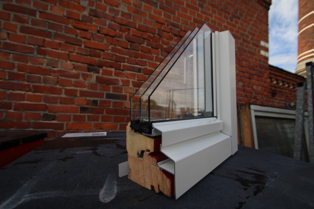 De opprinnelige vinduene var tolags. Disse er bygget om til å ta imot trelags glass med en samlet tykkelse på rundt 48 mm. For å få dette til er det utviklet en innfestingsløsning i aluminium som gjør det mulig å montere tykkere glass i eksisterende trerammer. Utvendig er rammene kledd med aluminium for å redusere vedlikeholdsbehovet. Selve trekonstruksjonen er beholdt, blant annet fordi den består av kjerneved med dokumentert lang levetid.
